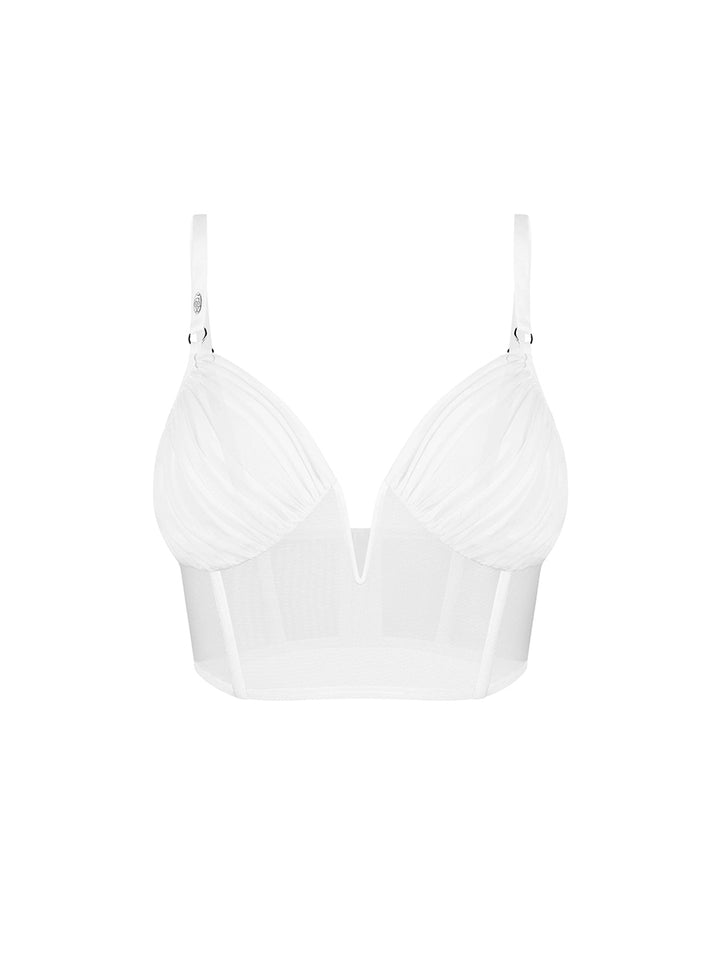 The Aurorium White top sculpts your curves with precision-engineered vertical boning and a plunging V-neckline. Adjustable straps and closure ensure a customized fit, while sheer elastic mesh offers breathable, second-skin comfort. A statement piece for confident elegance.