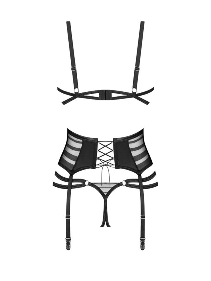It includes: a bra with oval cups for a flattering fit, a wide garter belt with integral straps and an open thong for a daring finish.