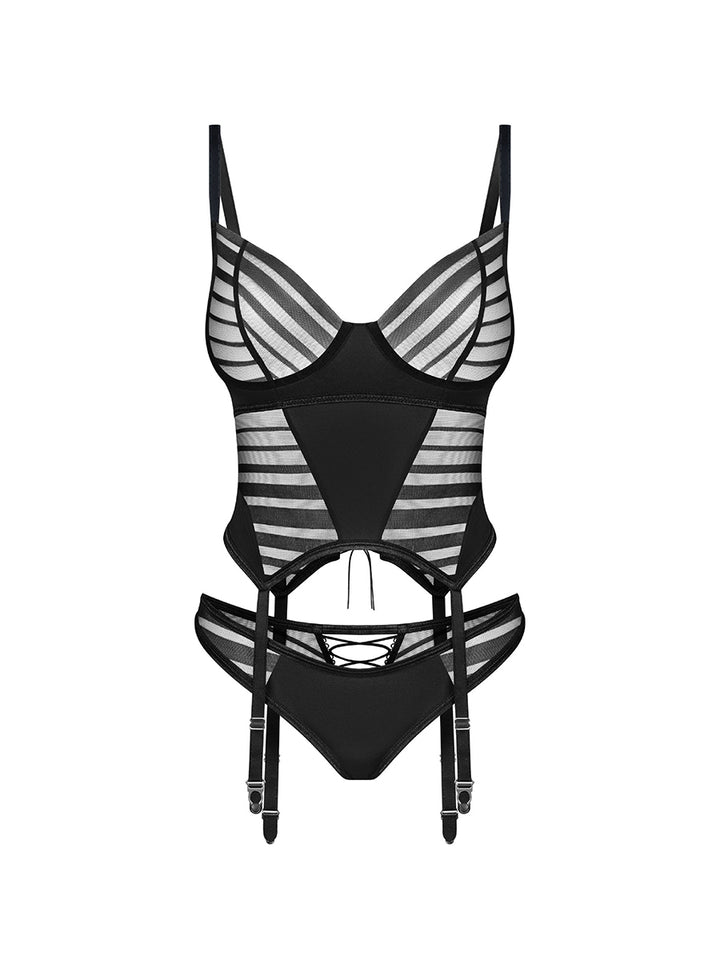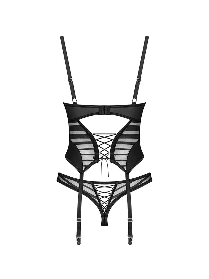 This Lune Bellis black lingerie set is designed to perfectly contour your figure. Crafted from a blend of luxurious fabrics, it features a corset with oval, underwired cups and adjustable garter belts.  The wide, adjustable straps, hook-and-eye fastening, and elegant lacing at the back provide both style and comfort. The thong completes the set with decorative ties on the buttocks for an enticing finish.