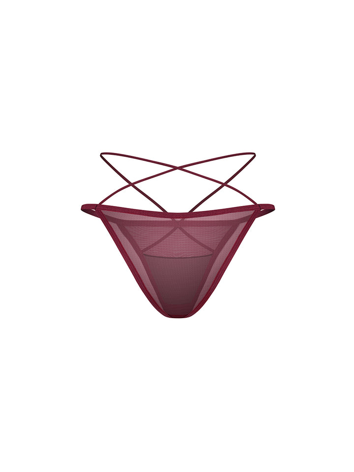Transform your lingerie game with Parisel Mini Panties in deep burgundy with striking black accents and elegant trim along the hips exude sophistication. Made from transparent mesh, they feature delicate crossing straps both front and back, adding a touch of allure to their soft, luxurious feel.