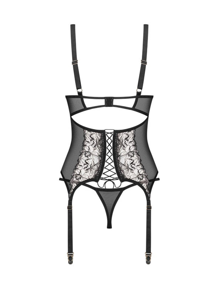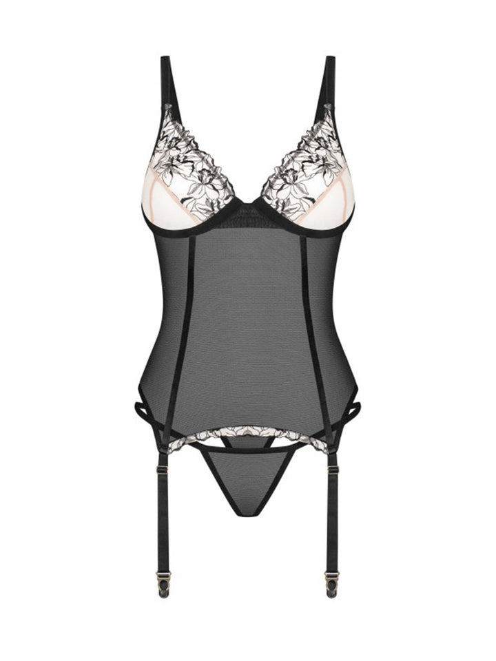 A corset with floral inserts. This lingerie astounds with its see-through fabric and non-detachable garter straps. The soft material delicately snugs the waist while emphasising feminine charm. This is an option for self-confident women who know what they want.