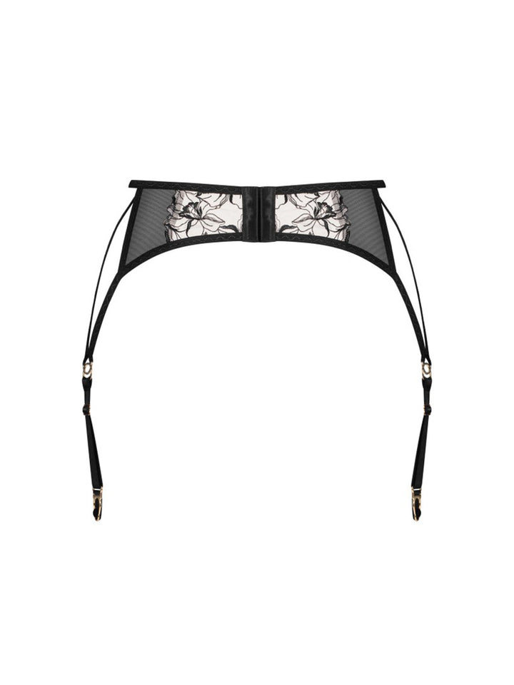 Black garter belt with accents embroidered on a cream-coloured tulle. Its minimalist form exposes the figure in a seductive way, making it a sensual complement to your next evening.