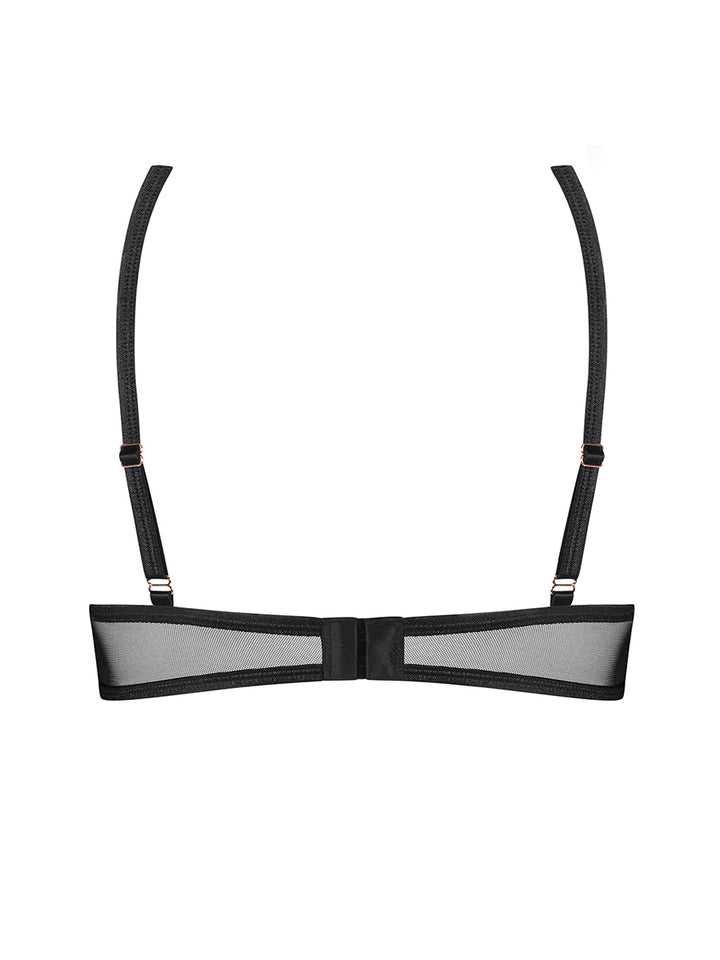 The bra combines a classic design with modern details. An open [quarter cup] design in black, decorated with delicate metal accessories in a shade of rose gold. With adjustable strap lengths and a customizable fit ensured by hook-and-eye fastening, this bra promises both comfort and confidence.