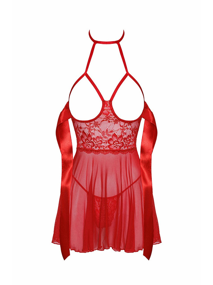 • Design: The highlight of this babydoll is the seductive satin ribbon bow that adorns the bust, offering a playful tease. The cups are framed by adjustable straps that connect to a halter-style neckline, ensuring a perfect fit and accentuating the bust. The back features a deep scoop, showcasing the back beautifully.