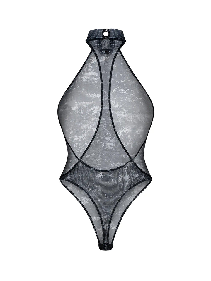 A sheer bodysuit in a striking color and bold design. The elastic fabric hugs the body, while the high-cut visually elongates the silhouette. A strap of fabric runs across the open back, creating a unique style. With its silver OSSV pendant and a short mock neck, there’s no need for additional accessories.