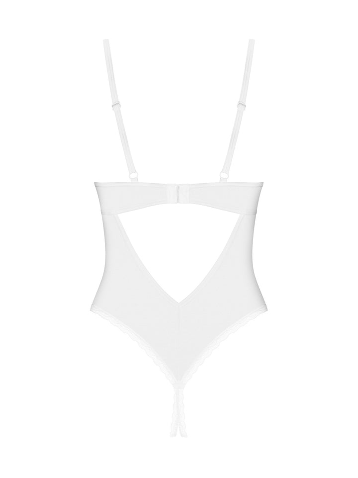 A sexy snow-white bodysuit with an open crotch. The minimalistic form combined with subtle accessories will emphasise your feminine curves. A perfect idea for romantic occasions that will leave you both enchanted!