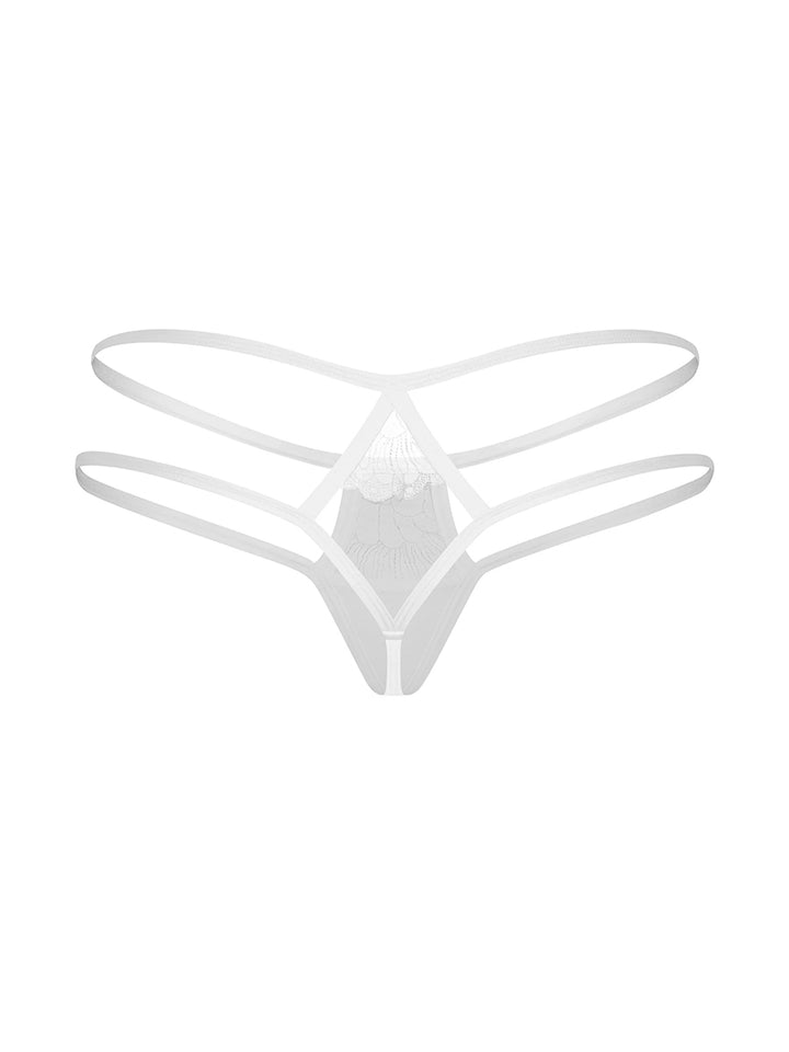 White can be provocative too. Lace with subtle embroidery is framed by a geometric composition of elastic straps. This unique design highlights the feminine silhouette and draws attention. A sheer panel teases more than it reveals, while the decorative pendant adds an elegant finishing touch.