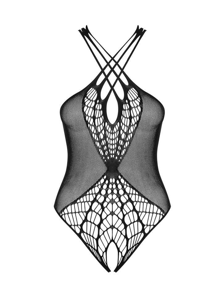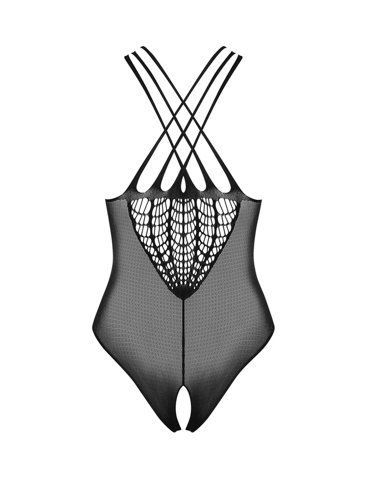 Flexible, knitted teddy in black. Thin straps crossing on the neckline and back add sex appeal and create a very intriguing styling. The delicate materials adhere beautifully to the body, emphasising the assets of the figure. The open crotch is a very bold and sensual element that will allow even more pleasure.