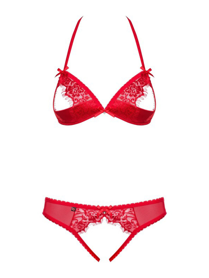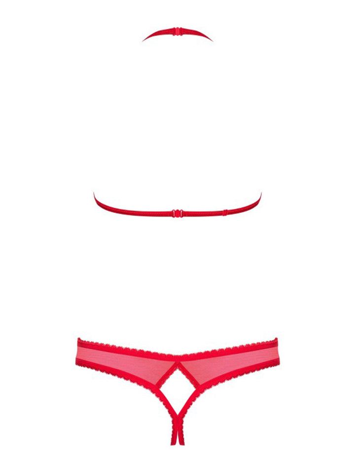 Want to book him a sexy surprise? Start by getting yourself this beautiful crotchless red set from the Obsessive new collection. Put on it and feel your power of seduction operate. Designed in transparent mesh and fine lace, this ultra-glamorous set will allow you to spend an exquisite moment with your partner. The bra features an adjustable neck strap and a multi-notch closure at the back. Did2Fit solution for a perfect fit.